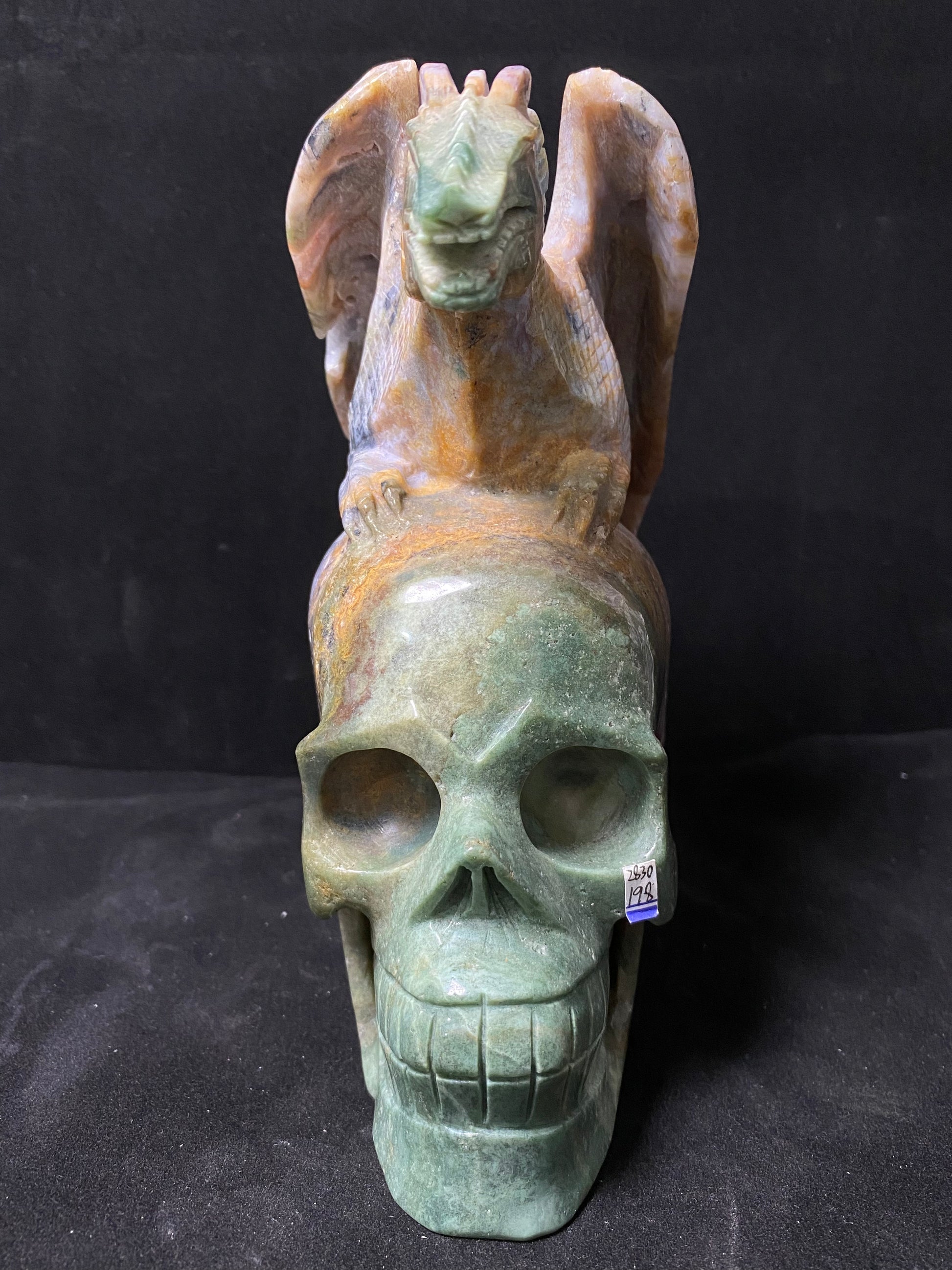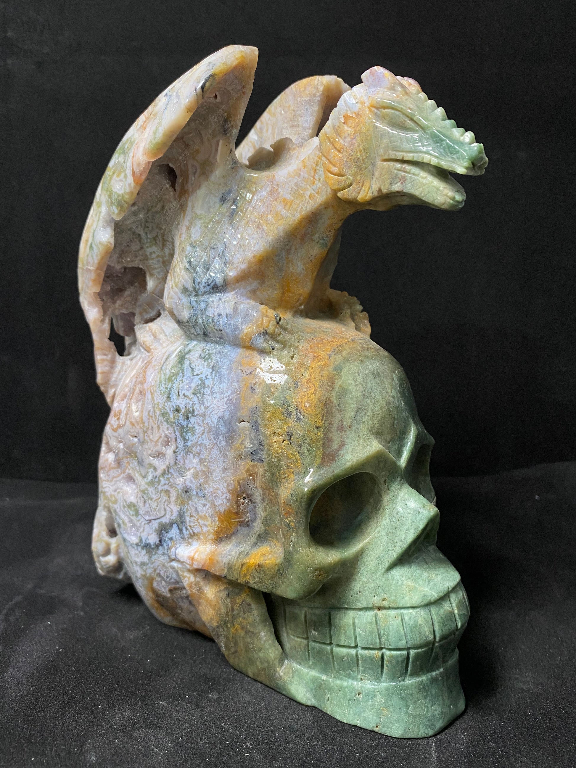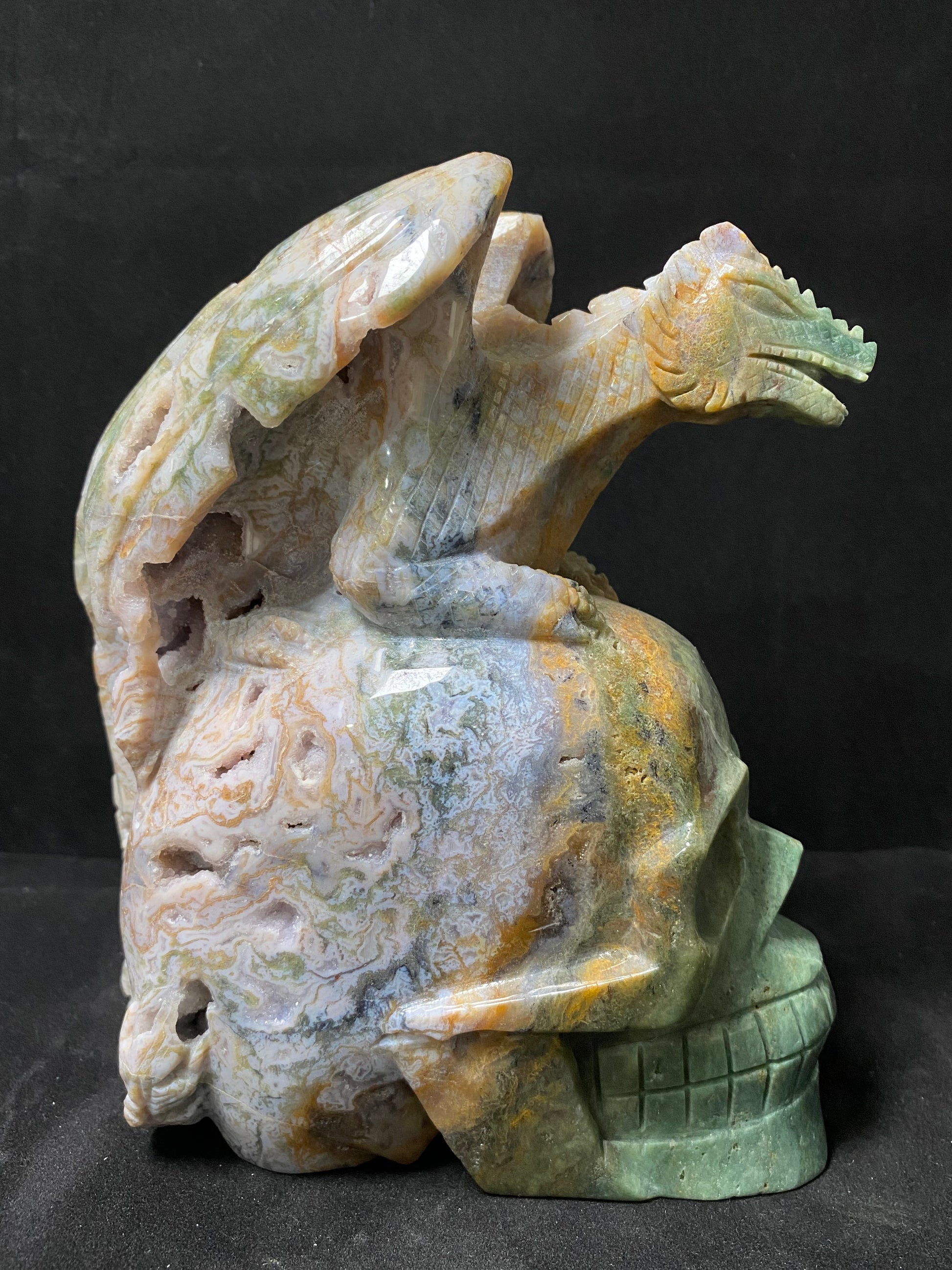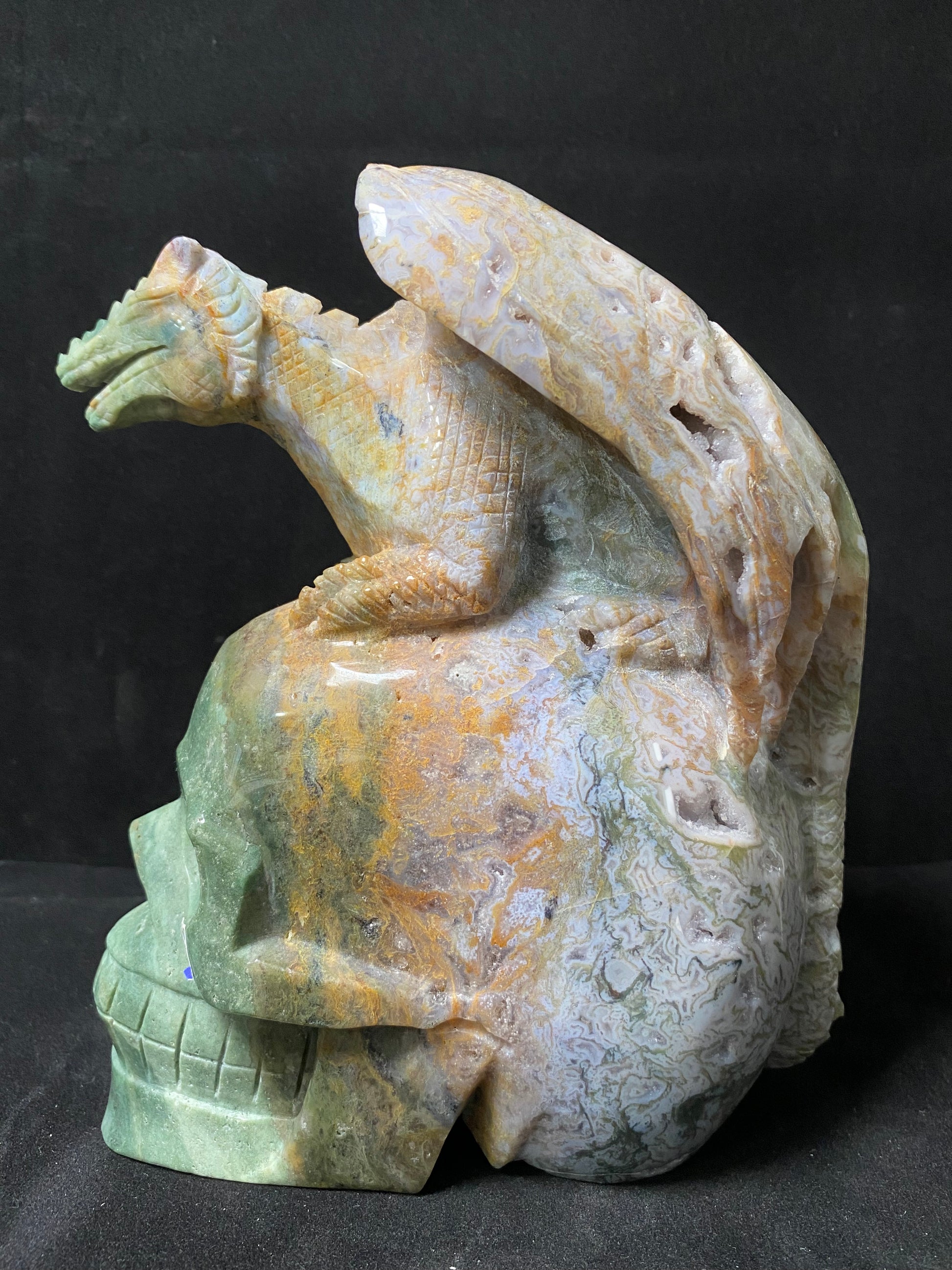 073-Geode moss agate flying dragon on skull #2830