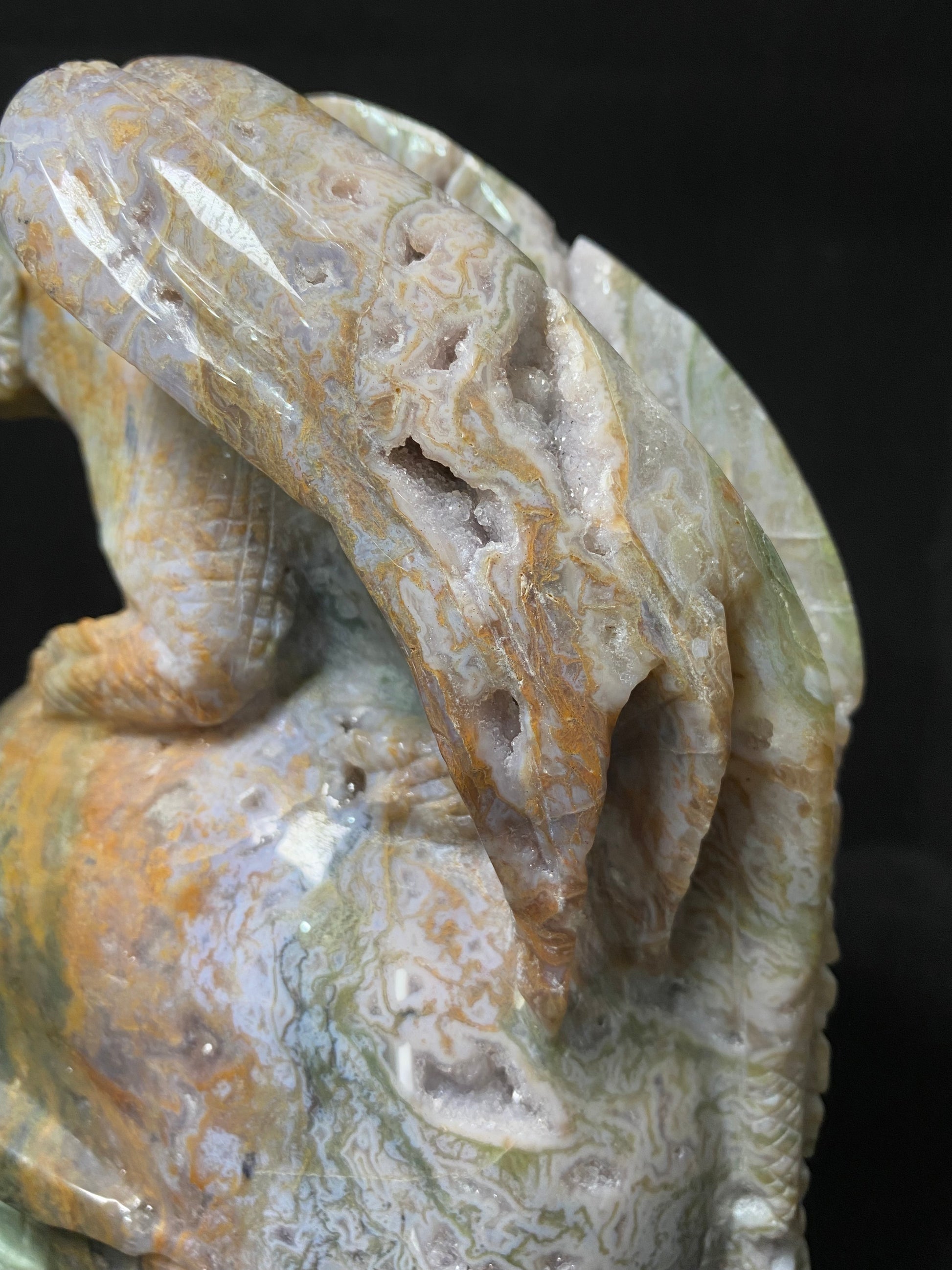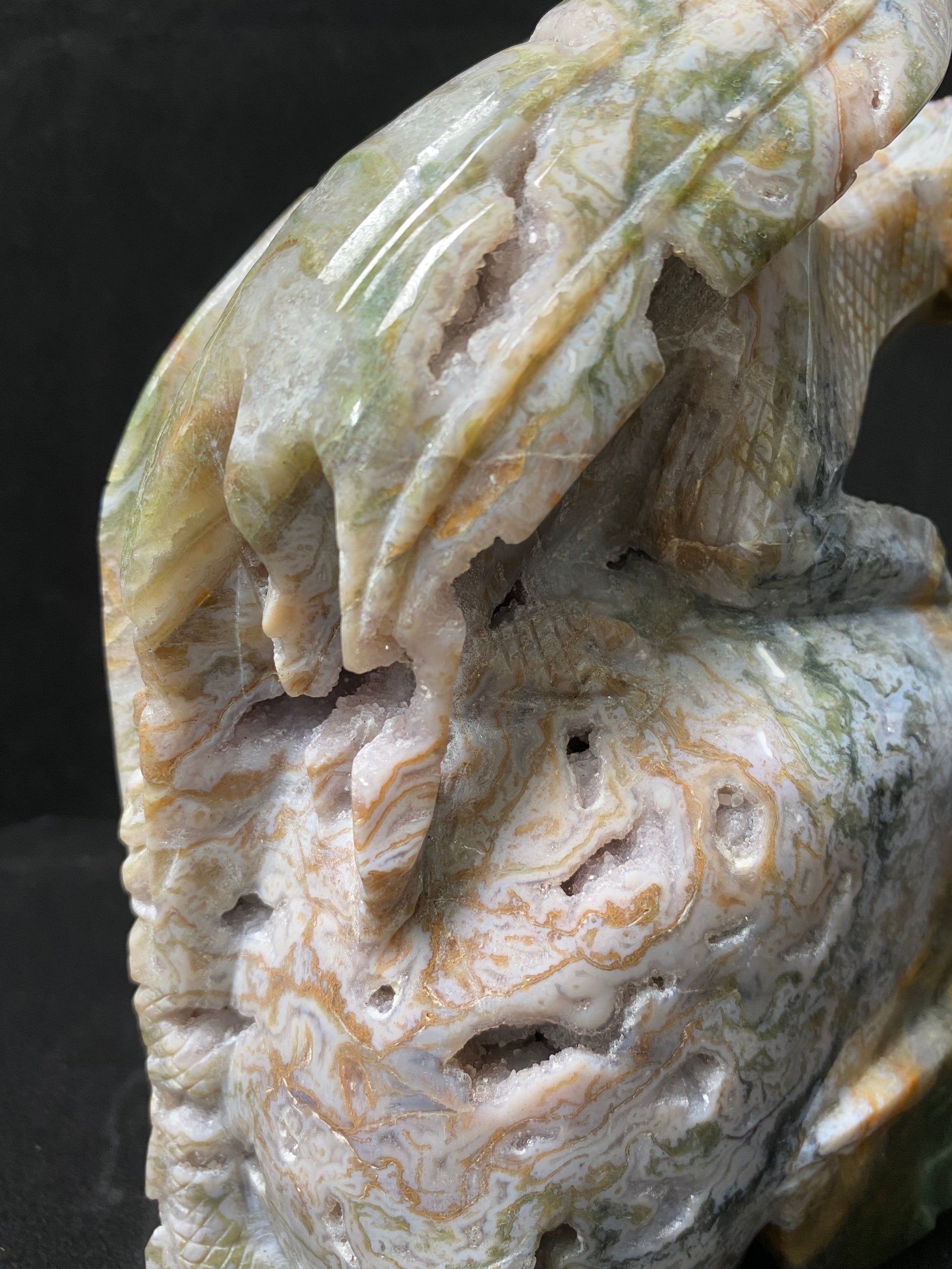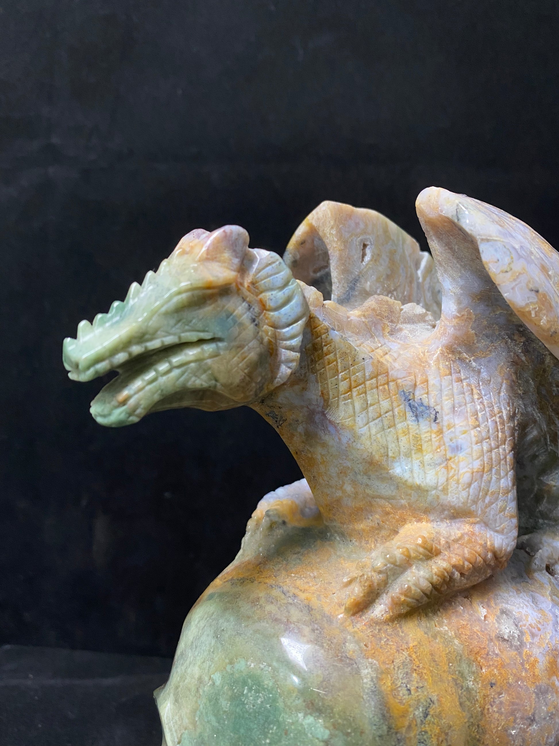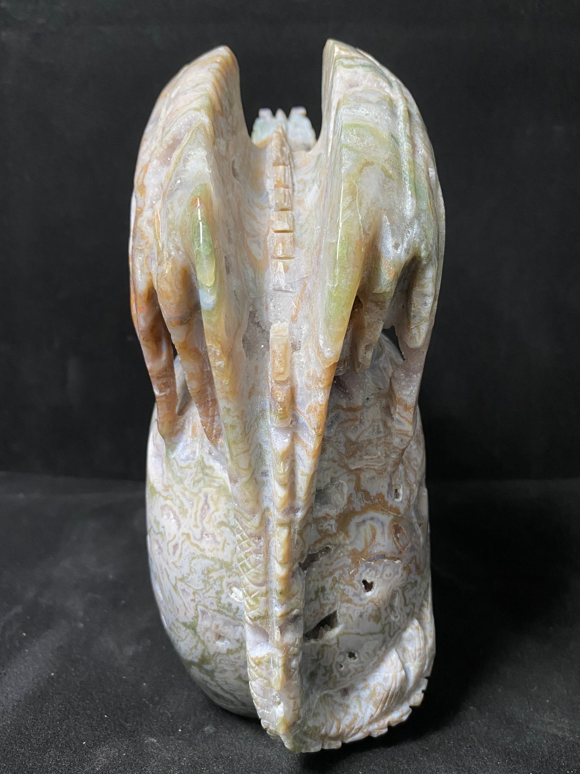 073-Geode moss agate flying dragon on skull #2830