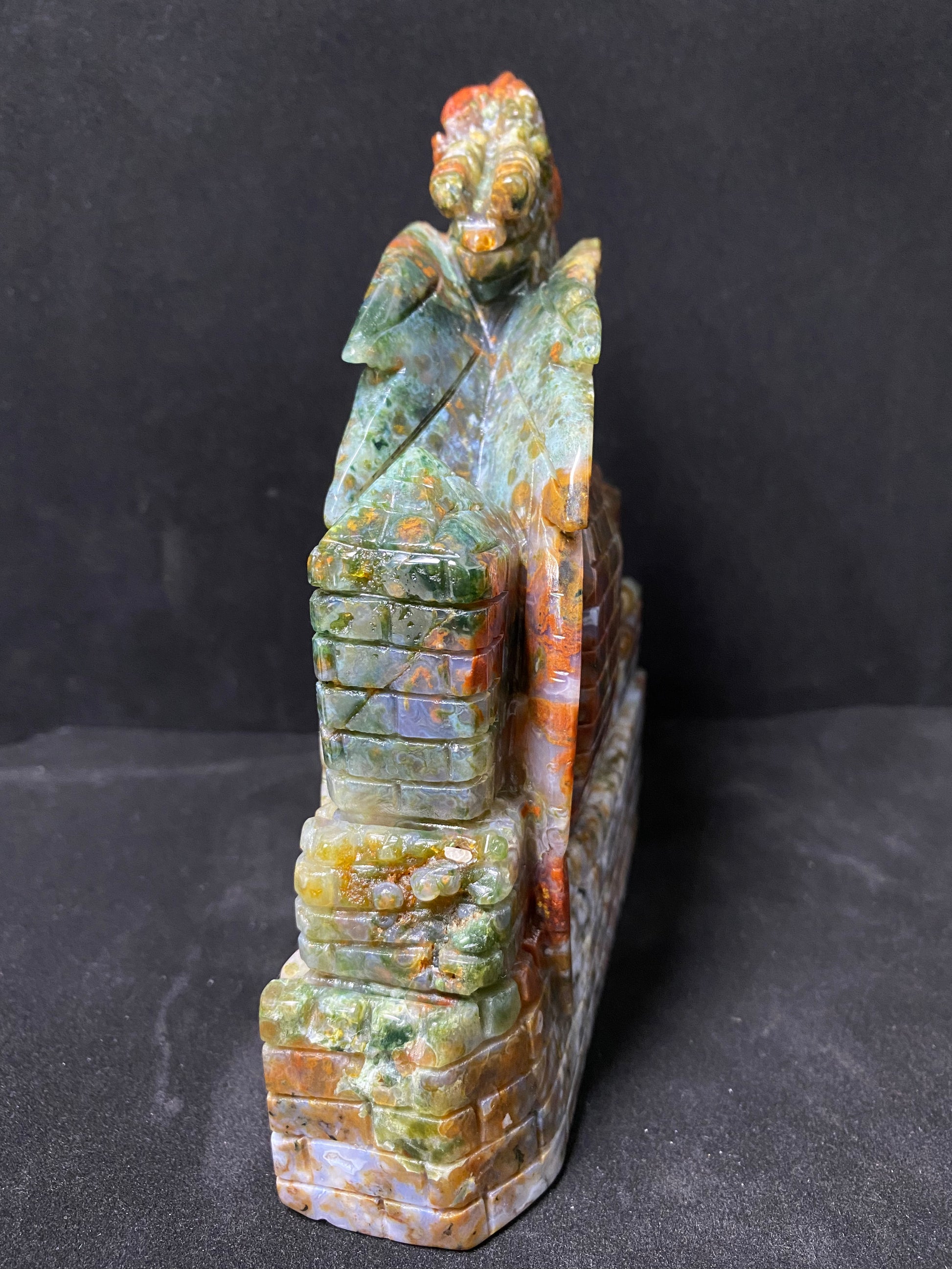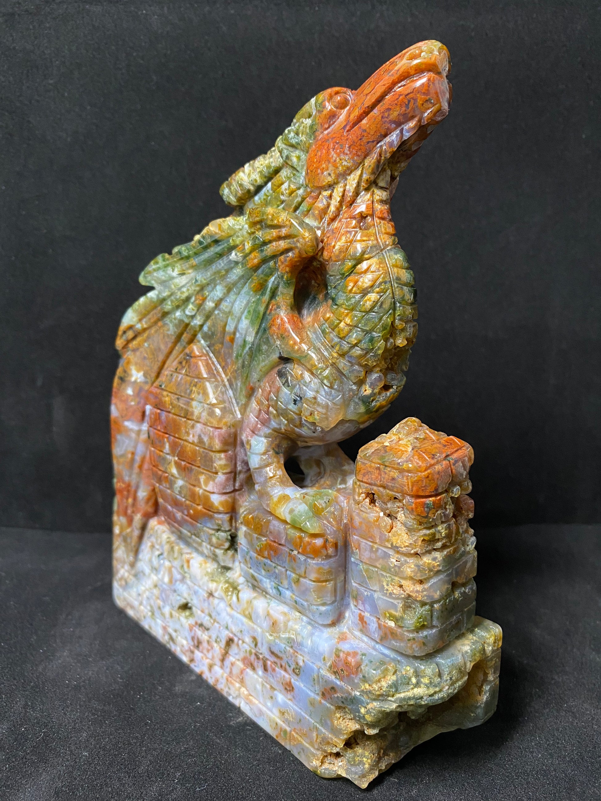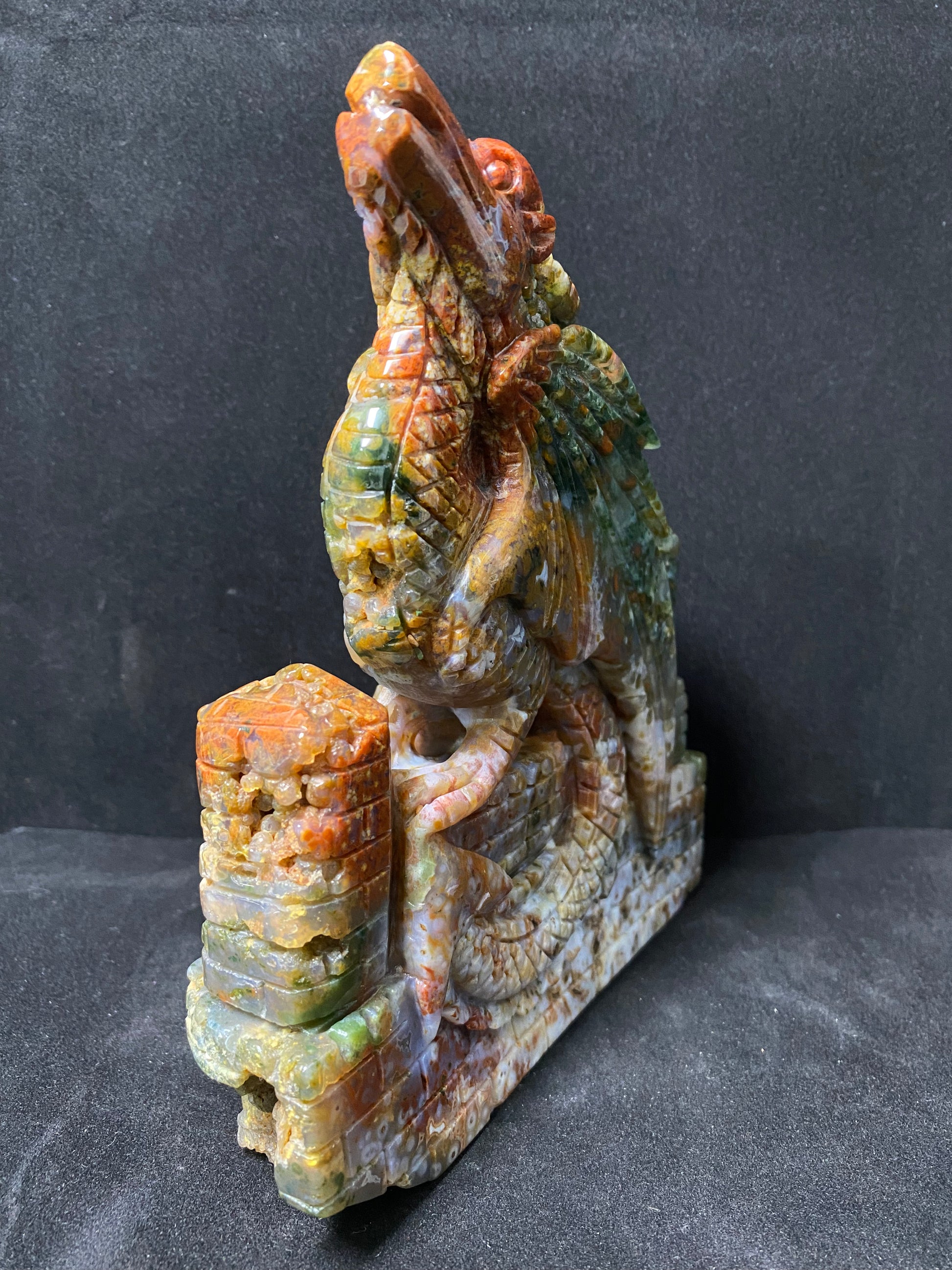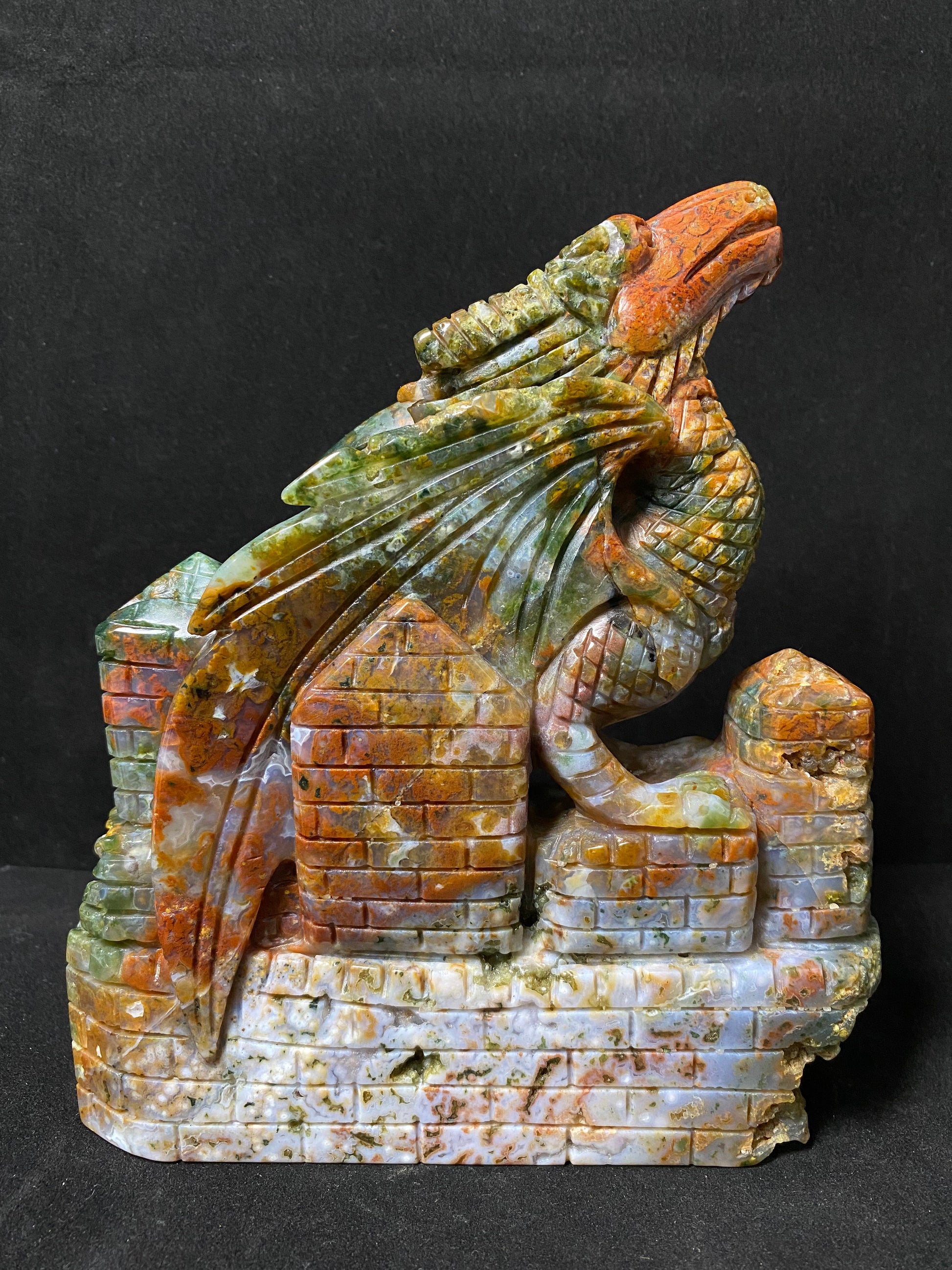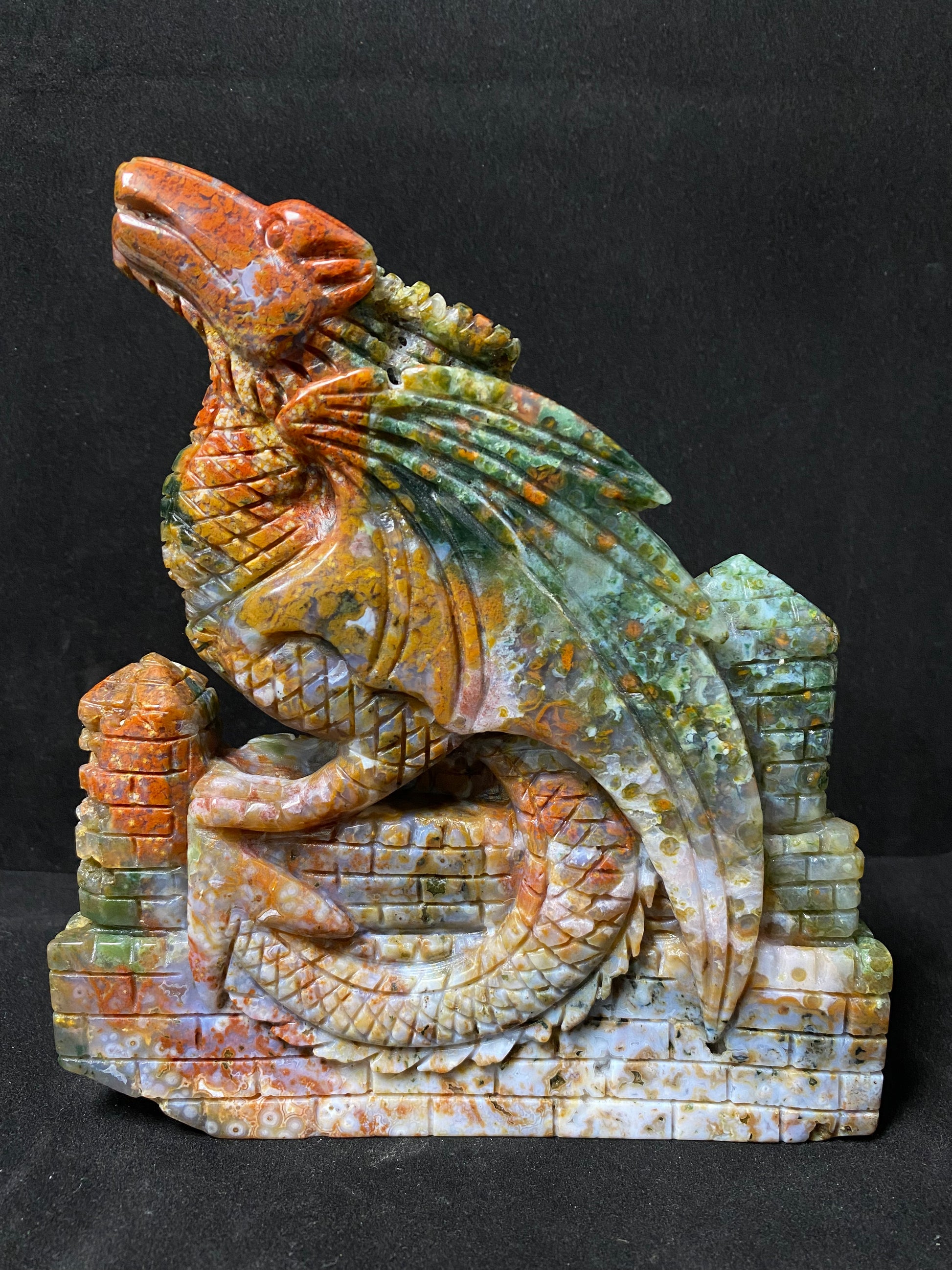 083-Ocean jasper with circles flying dragon on castle carving #1583