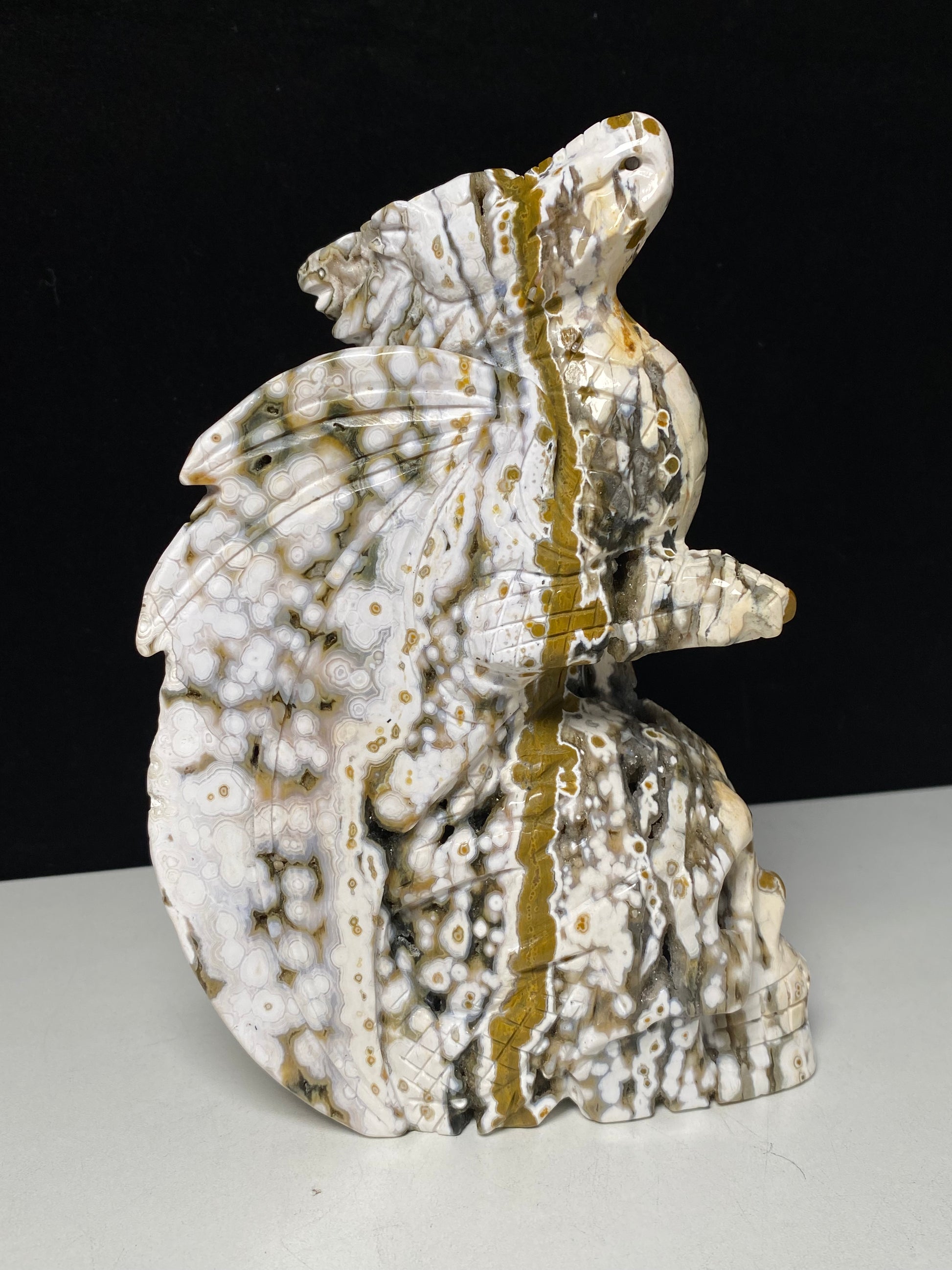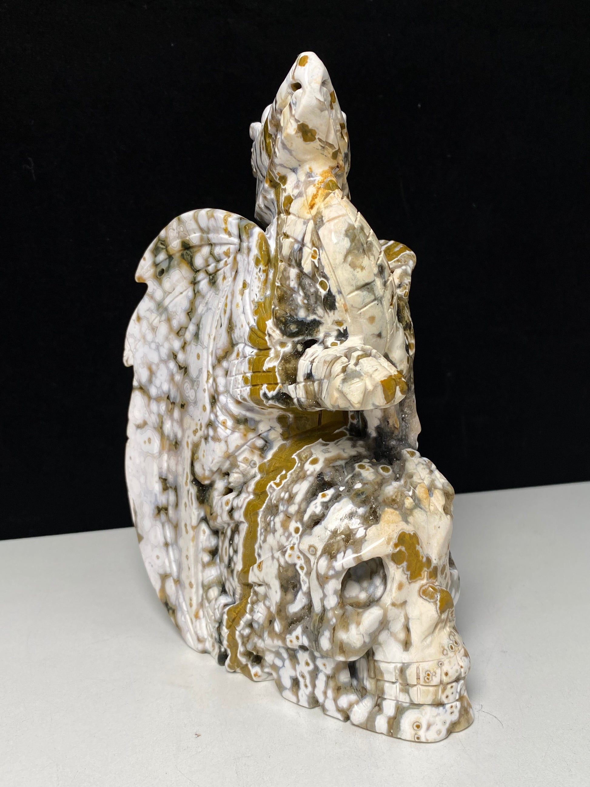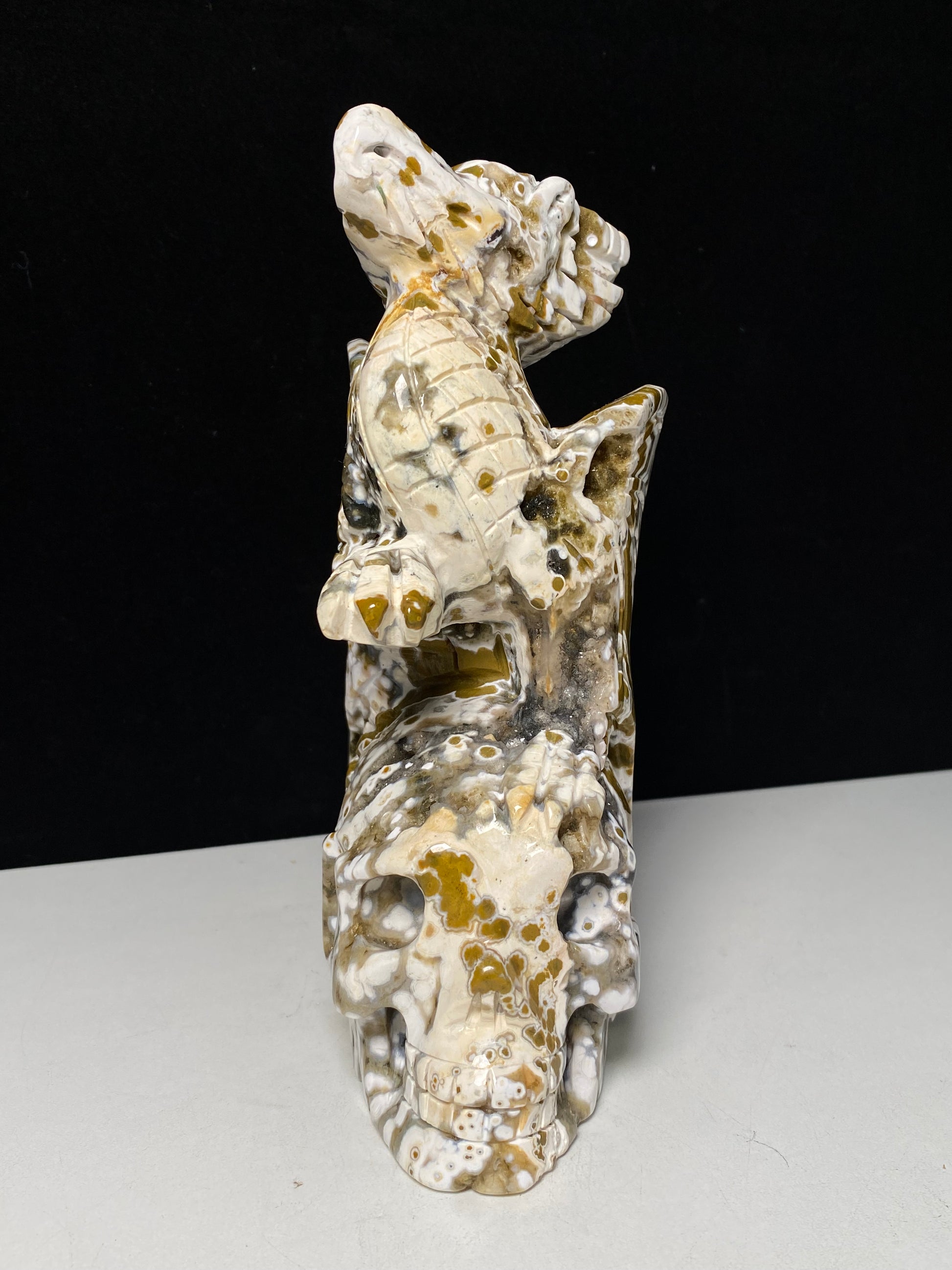 068-Ocean jasper with circles flying dragon on skull carving #1570