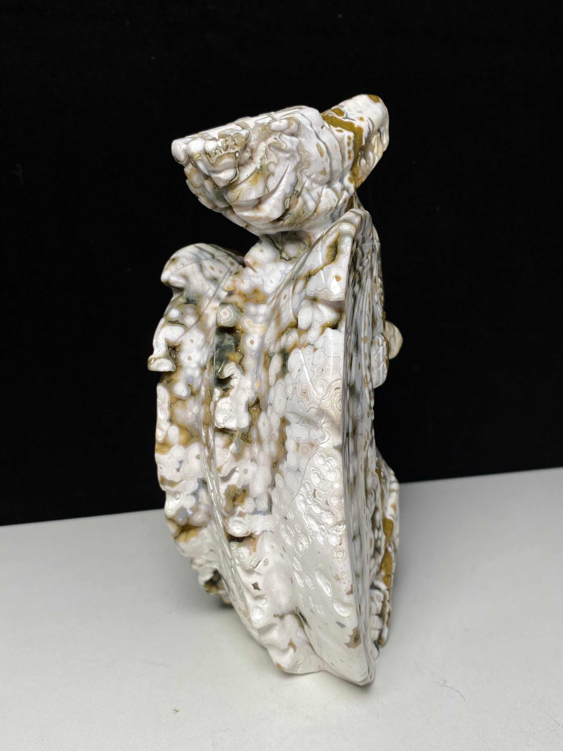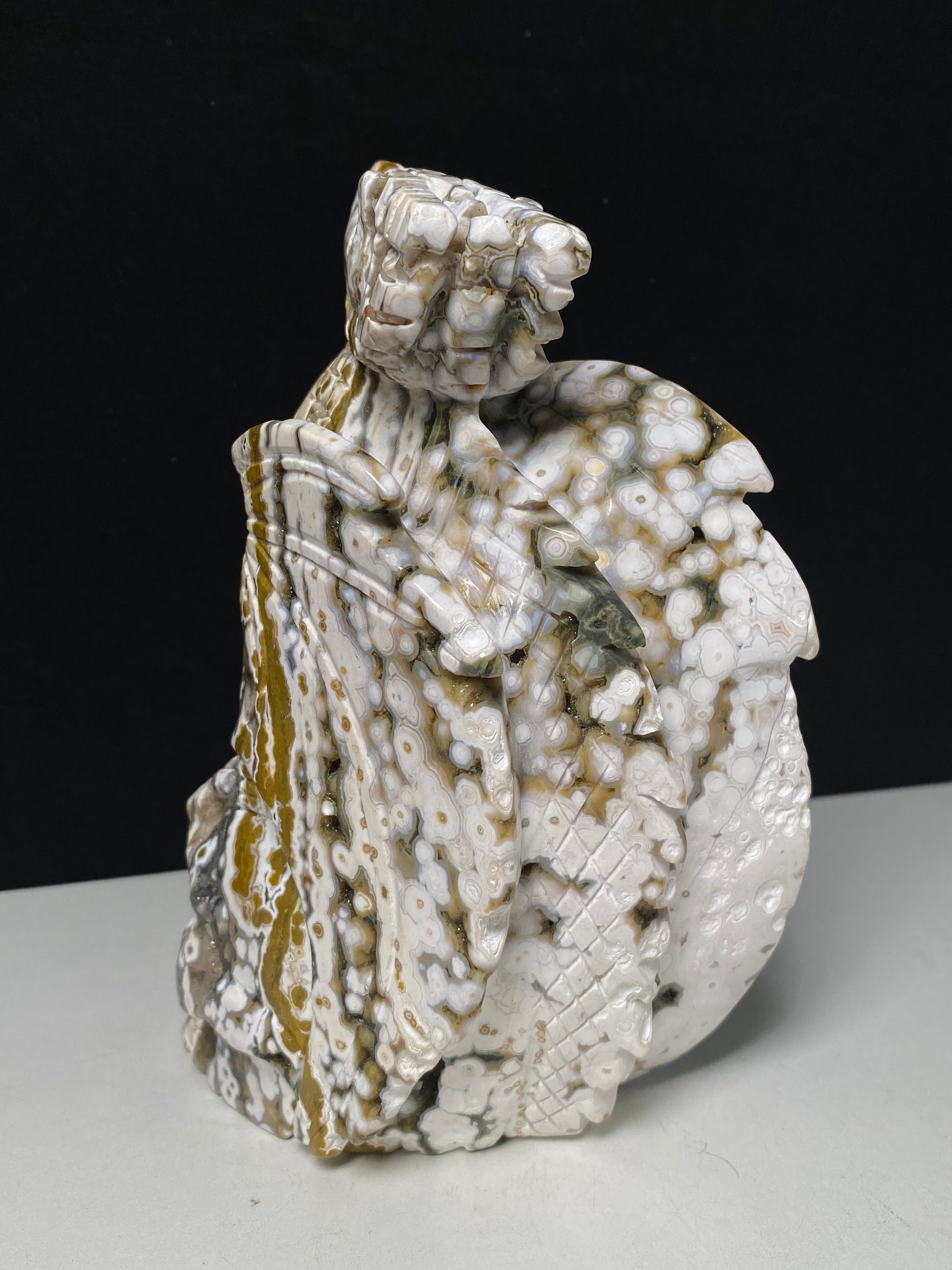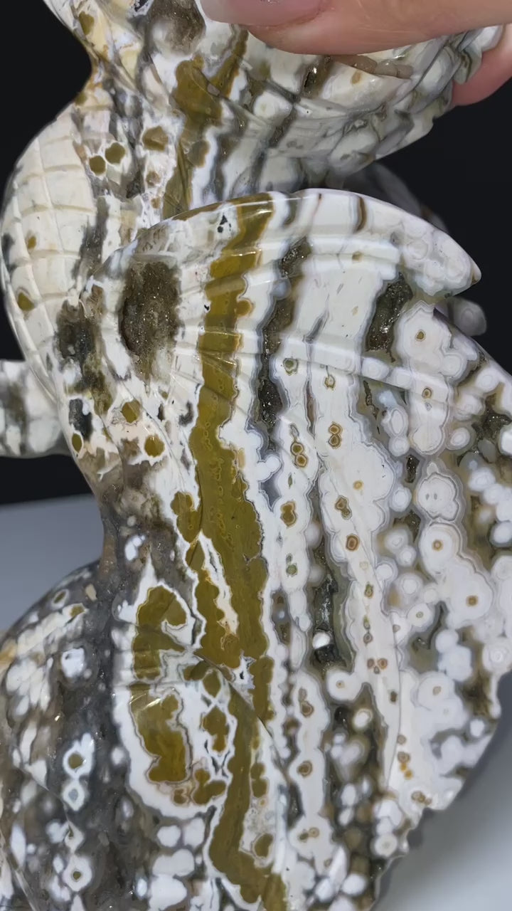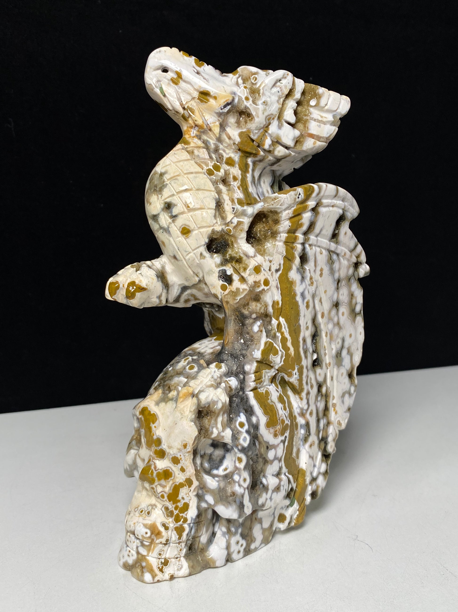 068-Ocean jasper with circles flying dragon on skull carving #1570